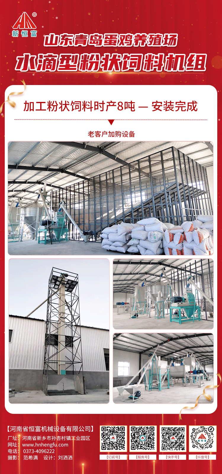 山東青島蛋雞養殖場,時產8噸粉狀飼料加工機組(zǔ)安裝完成。