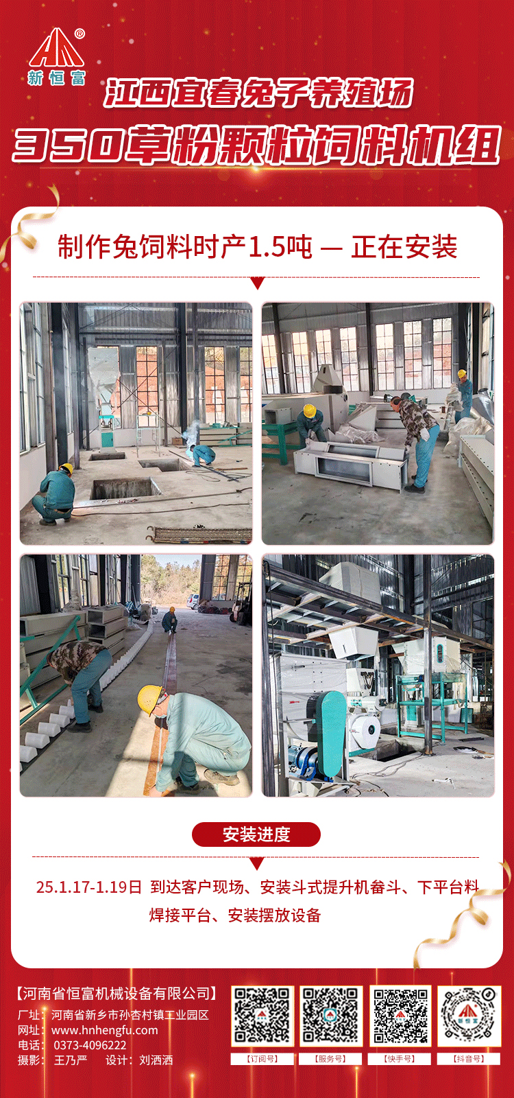 江西宜春兔子養殖場,時產1.5噸草粉(fěn)顆粒飼料加工機組正在安裝。
