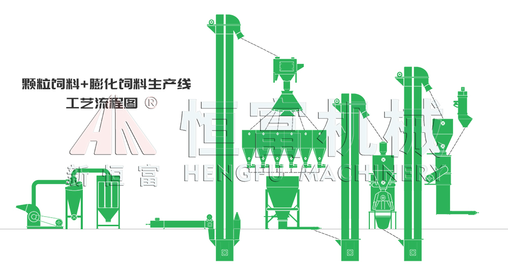 膨化料生(shēng)產線(xiàn):水滴式飼料粉碎(suì)機、單軸雙螺旋飼料(liào)混合機、幹法飼(sì)料膨化機、烘幹機、噴塗機、逆流式飼(sì)料冷卻器及掛篩、飼料(liào)包裝(zhuāng)秤(chèng)、空壓(yā)機、鍋爐、以及提升輸送設備。