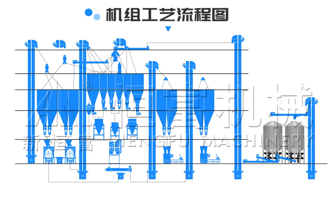 采用先配料後粉(fěn)碎工藝:先配料後粉碎,原料經提升機入料(liào)塔,送除雜機除雜,進配料秤(chèng)配料;粉碎後與預混料、添加劑等進行混合,入成品倉(cāng)。