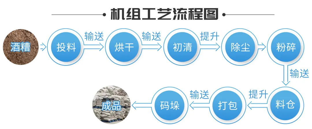 該設備生產線主要是以烘幹後的酒糟為原料來製作牛的精補飼料(liào)。前端先對濕酒糟進行烘幹、初清處理,然後再進行粉碎、混合、包裝、碼垛等。