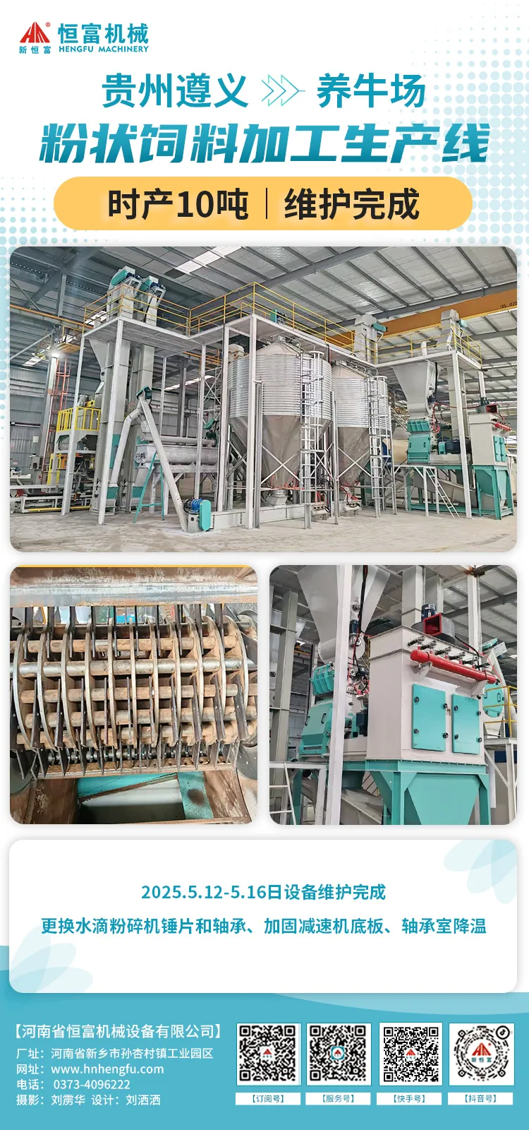 貴州遵義養牛場,時產10噸粉狀飼料加(jiā)工生產線(xiàn)設備維護完成。