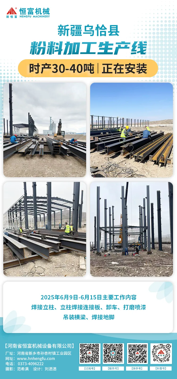2025年6月9日至6月15日主要工作內容:地基水平校準,立柱打梁,焊接立柱和連接板,打磨噴漆除鏽,吊裝橫梁,焊接地腳。